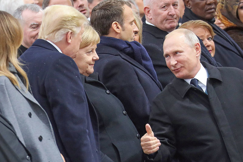 去年11月11日,在法國參加一戰停戰百年儀式時,普京向特朗普豎起大拇指。這個看似不經意的肢體語言表明:普京發自內心敬佩特朗普。(AFP)