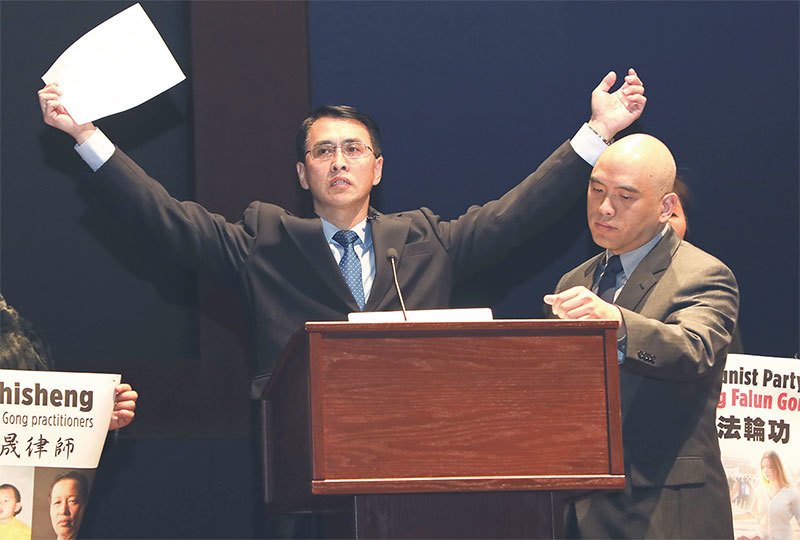 5月20日,Fox 11臺獨家播出中共迫害法輪功的深度調查《一個姐姐的救贖》。其中不少畫面是法輪功學員于溟在中共勞教所內用針孔攝像機拍到的。圖為于溟在新聞發布會上演示中共監獄的「吊銬」酷刑。(攝影/林樂予)