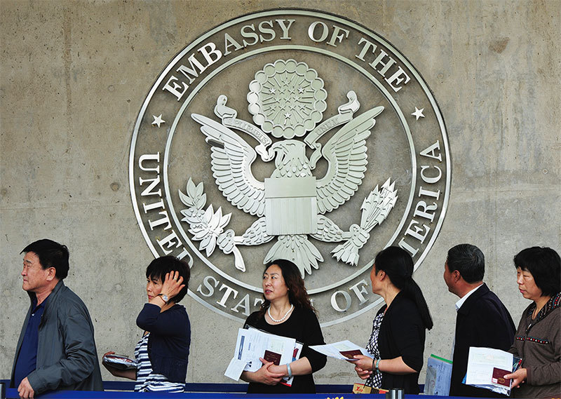 「反美是工作,赴美是生活」,很多共產黨官員的老婆、孩子、錢財都在美國。但現在行不通了。圖為在美國駐華大使館排隊等待提交材料的簽證申請者。(AFP)