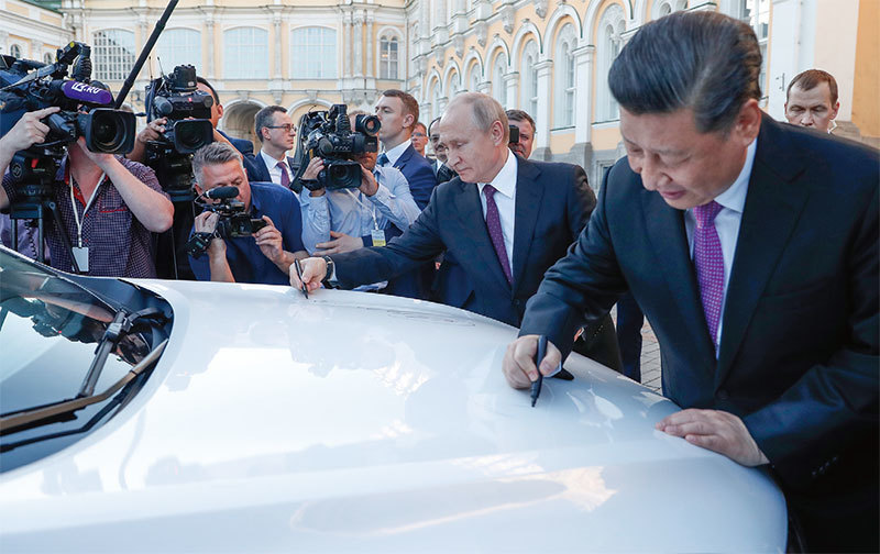 面對美國的不斷進攻,中共卻開始了「連俄抗美」的遊說活動。圖為習近平6月5日抵俄與普京會晤,尋求經貿合作。(AFP)