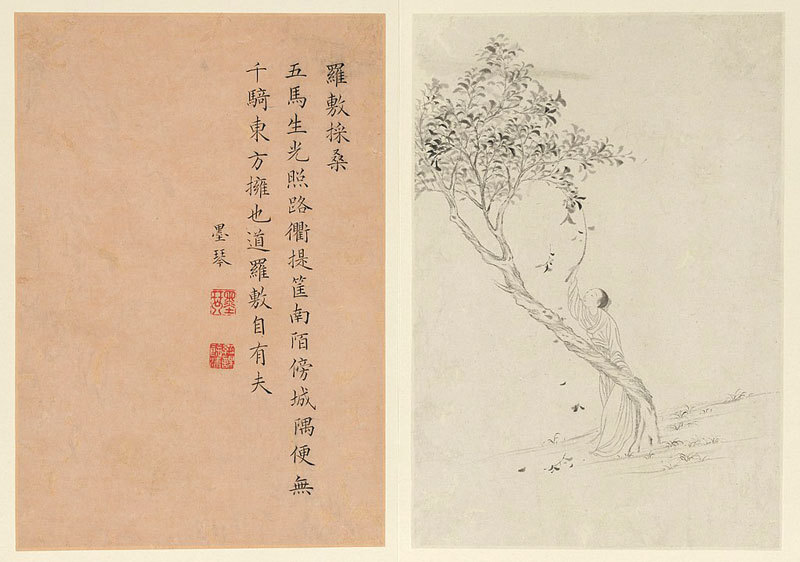 《畫麗珠萃秀》冊之「秦羅敷」,清赫達資繪,梁詩正題。(公有領域)