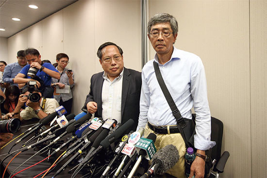 銅鑼灣書店店長林榮基(右)2016年6月在記者會上指控,2015年10月在深圳遭公安扣押,之後乘動車被帶到了寧波。(蔡雯文/美國之音)