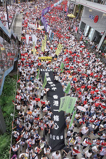 自從1997年之後,香港民眾堅持民主自治,多次爆發反對中共暴政的大遊行,如2003年7月1日中共建黨日的50萬港人上街反《基本法23條》(有關顛覆罪)大遊行,主辦方說有50萬人,警方說有35萬,不過已故民主派元老司徒華(在回憶錄《大江東去》)說,警方用直升飛機觀察得出數據說:遊行人數65萬。由於港人的反對,《23條》被無限期擱置。