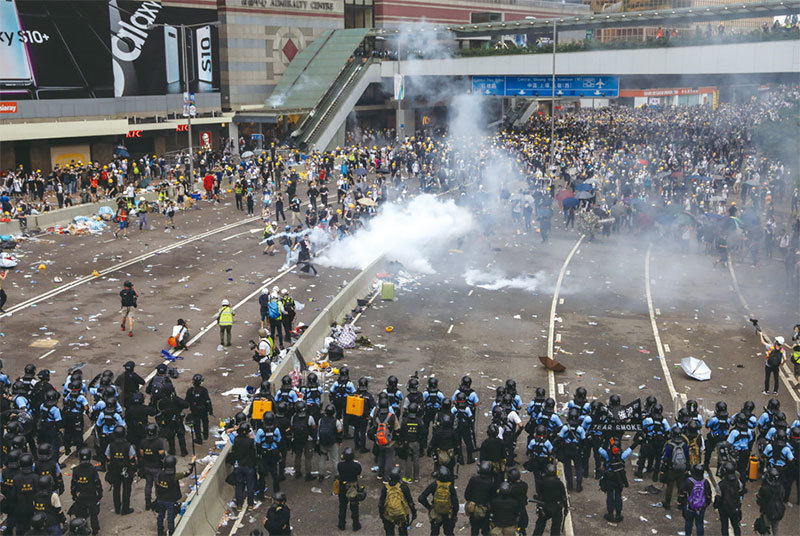 6月12日,港府出動催淚彈、橡膠子彈和布袋彈等驅散反對送中條例的示威者。(AFP)