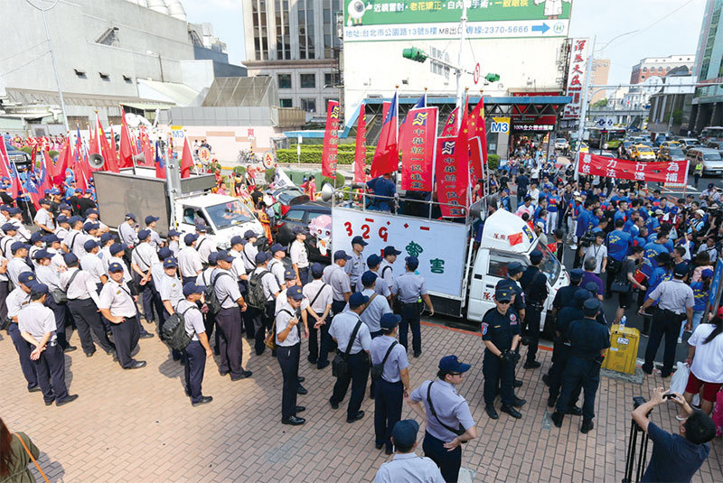 鄰近香港的臺灣,更需警惕防範中共滲透。圖為「白狼」張安樂率領高舉中共五星旗的統促黨頻傳暴力事件,擾亂臺灣社會。(中央社)