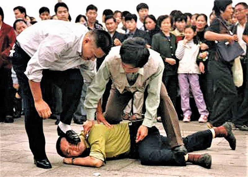 這讓人聯想到在海外廣為流傳的一張中共便衣警察在天安門廣場抓捕和平上訪的法輪功學員時,便衣警察把上訪者的頭部踩在腳下的照片。