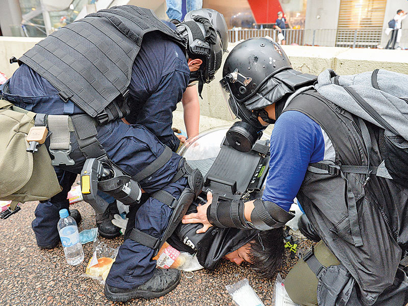 2019年6月12日,香港「反送中」示威衝突升高。圖為兩警察把一抗議者臉到壓在地上,很像大陸警察的動作。(宋碧龍/大紀元)