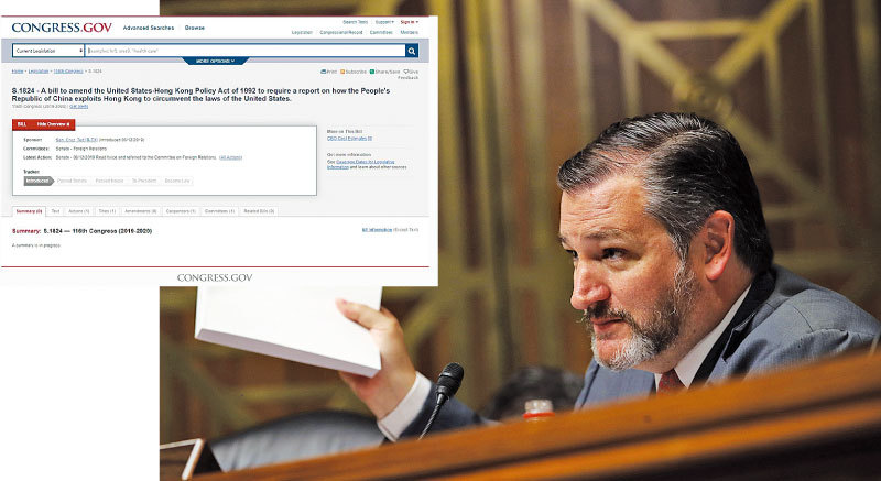 美國參議員泰德.克魯茲(Ted Cruz)6月13日正式提出修訂1992年《美國-香港政策法案》的法案。(新紀元合成圖)