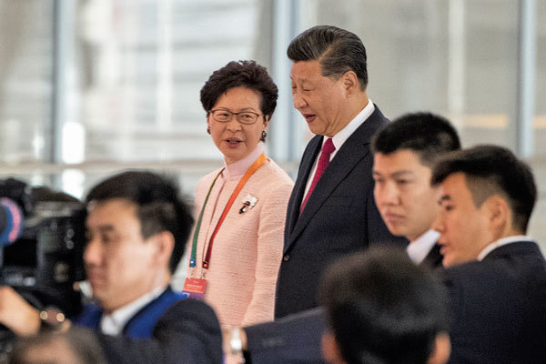 2018年10月23日,習近平和林鄭月娥出席港珠澳大橋通車儀式。(AFP)