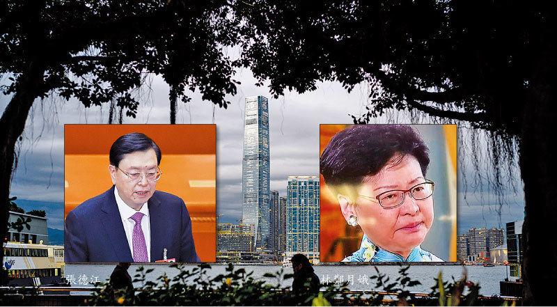 2017年香港特首選舉時,由於江派張德江的直接干預,才使民調和民望都不高的林鄭月娥當選,成為江派在香港的代理人。(新紀元合成圖)