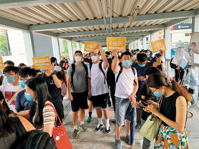 香港反送中遊行之際,中共竭力封鎖消息,「支持香港」或「香港加油」成為微博敏感詞,無法正常搜尋。圖為港民在中信橋舉起寫有「撤回、香港加油」的紙牌。(李逸/大紀元)