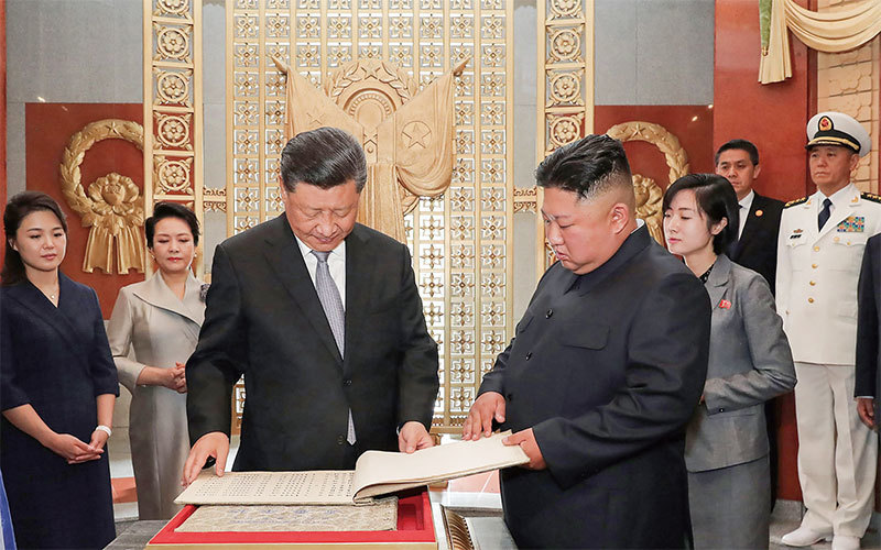 習近平突然在6月20至21日訪問北韓,很可能是在特朗普與習近平電話後,習近平才決定去北韓。圖為21日習金互動。(AFP)