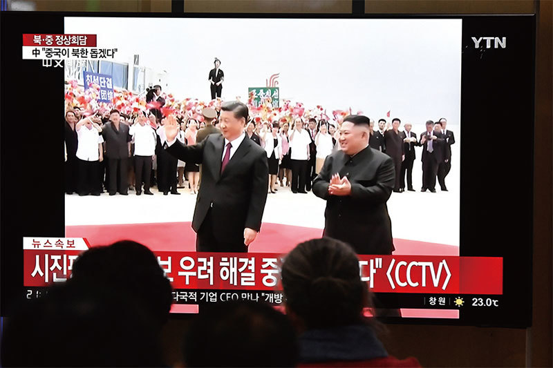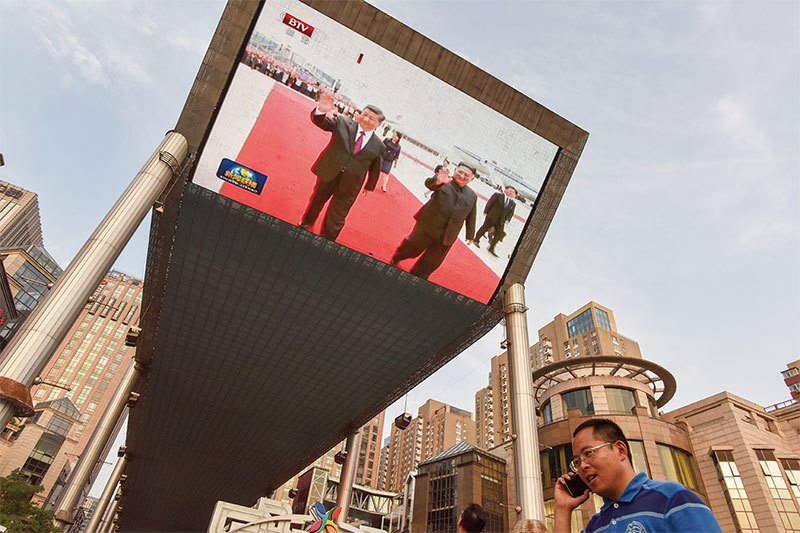 專家認為,習近平如果把北韓當作與特朗普談判的籌碼,將會是「嚴重錯誤」。圖為6月20日北京一商場外大屏幕上轉播習近平訪問北韓的畫面。(AFP)
