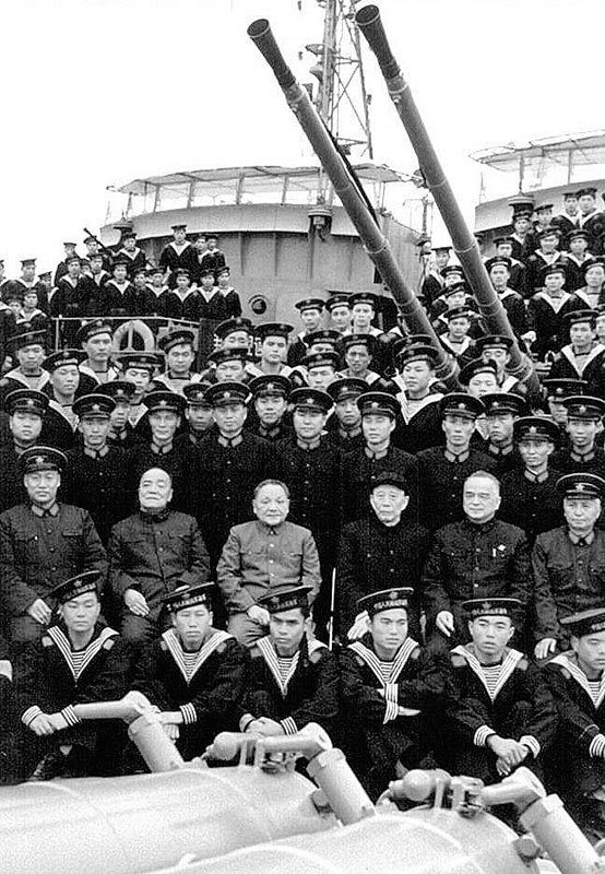 鄧小平時代中共「八大元老」中,王震(中排右三)是為己謀官圖利最貪得無厭的一個。圖為1984年王震與鄧小平(中排左三)與中國南海艦隊海軍軍官在一祕密地點。(AFP)