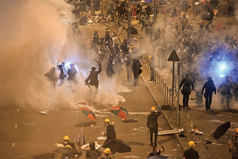 7月1日夜間,港警發催淚彈驅趕包圍立法會的抗議民眾。(AFP)