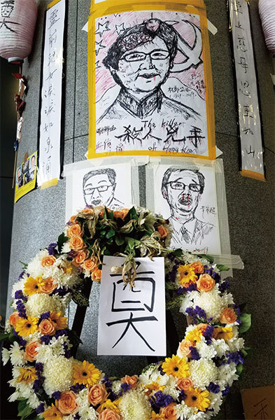 有市民在立法會示威區現場祭奠「反送中」烈士,牆上還貼出寫上「殺人兇手」的林鄭月娥畫像。(宋碧龍/大紀元)