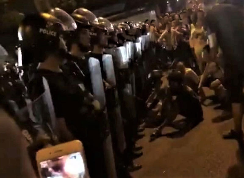 7月3日晚,上萬名民眾再次聚集在陽邏的街上。視頻顯示,一名男子戴上頭盔,盤腿坐在手持盾牌的警察面前,後來有幾名民眾也蹲在了這位男子的周邊,大家不停地喊著「抵制垃圾焚燒」、「還我青山綠水」。