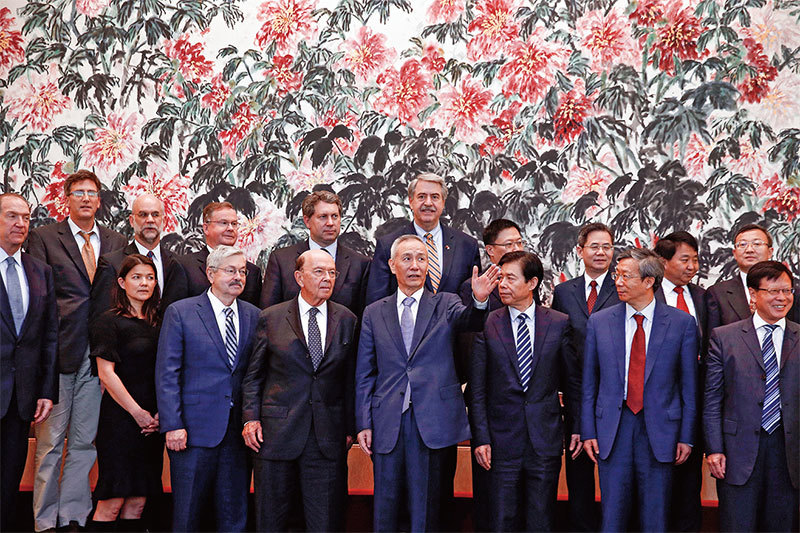 中方談判代表新增商務部長鍾山(前排右三)。他在2018年6月2日就出席了中美貿易會談。圖中前排左三是美國商務部長羅斯,中共副總理劉鶴是前排左四。(AFP)