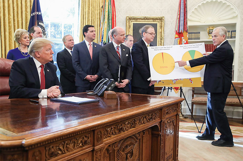 特朗普堅信沒有協議好過較差的協議。納瓦羅(右一)7月2日受訪時說,特朗普為美國人民做正確的事,這是他仰慕特朗普的原因之一。(Getty Images)