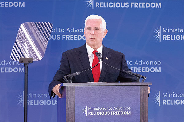 7月18日,美國副總統彭斯在宗教自由部長級會議上發言,批評中共迫害宗教自由,並表示美國人民會與有信仰的中國人民站在一起。(林樂予/大紀元)