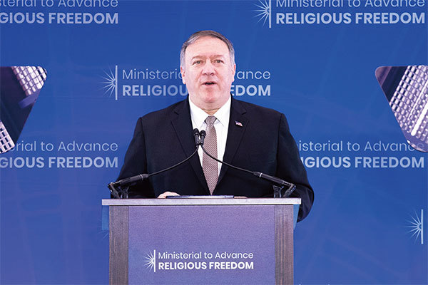 7月18日,美國國務卿蓬佩奧(Mike Pompeo)在第二屆推進宗教自由部長級會議上發言,特別提到了在中國受到迫害的法輪功學員案例。(林樂予/大紀元)