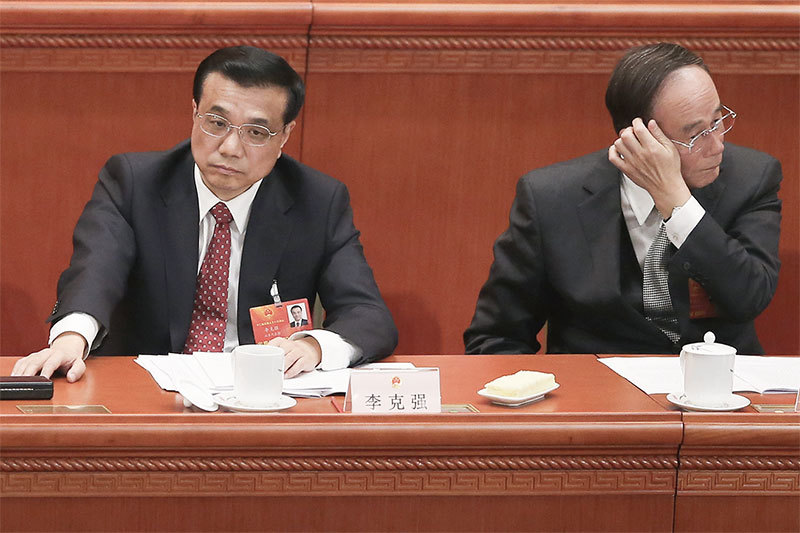 現在中共以毛左意識形態指導貿易戰,王岐山(右)、李克強(左)說不上話,而王滬寧等人卻在中南海大行其道,拋出文革式口號和政策,導致北京節節敗退。(Getty Images)