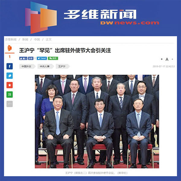 7月17日,總部在北京的多維新聞網發文〈王滬寧「罕見」出席駐外使節大會引關注〉,報導援引香港媒體稱,中共中央書記處常務書記王滬寧是陪同習近平接見的唯一一個政治局常委,這是多年來首次。