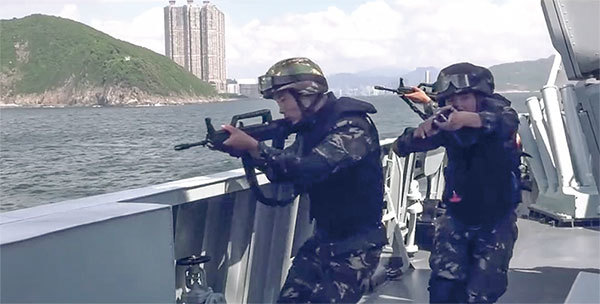 緊鄰香港的廣東公安機關近日在佛山舉行「大練兵」,並播出一段三分鐘「出征」影片,恫嚇香港意味很重。(AFP)