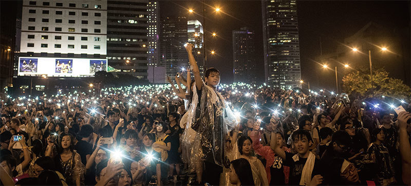 香港的抗暴行動有很多與眾不同的特別之處,香港群眾用歌聲面對強權暴政,這是非暴力的抗爭。圖為2014年香港雨傘運動期間,群眾揮動手機唱《海闊天空》的情景。(Getty Images)