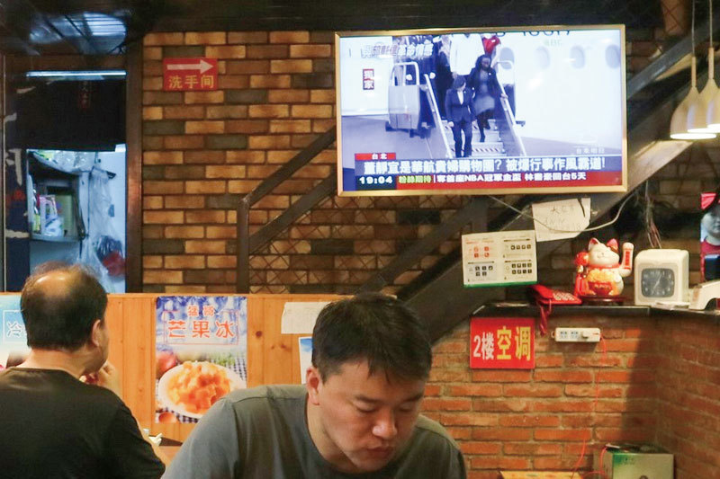 香港「反送中」抗爭已持續兩個月,中共嚴密封鎖消息。但上海很多餐廳出現翻牆機上盒,顧客一邊吃飯一邊翻牆看新聞。圖為上海一家餐廳正在播放臺灣的電視新聞。(中央社)