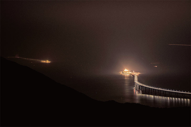 港珠澳大橋有兩個形似蛇頭的人工島,「兩蛇對沖」破壞了香港的風水。(AFP)