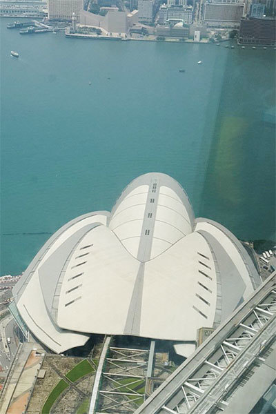 香港會議展覽中心俯視圖就像一隻石龜,正在朝海邊爬去。(維基百科)