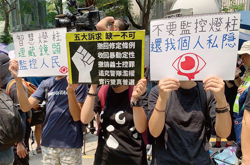 王滬寧要求中共官媒向香港派駐大量記者,充當國安耳目,將示威人臉傳送至中共龐大的監控網絡。圖為8月24日反送中民眾反對港府架設監控燈柱。(駱亞/大紀元)