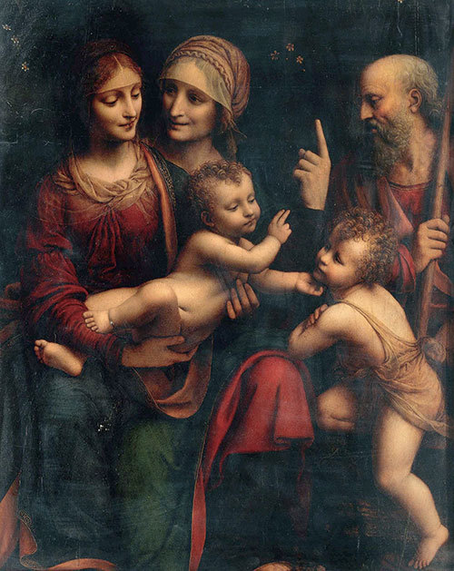 貝納迪諾.盧伊尼(Bernardino Luini),〈聖家族與聖安妮和小施洗約翰〉,約1503年作,米蘭盎博羅削圖書館藏。(公有領域)