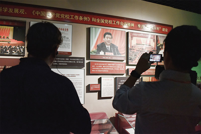 習近平在中央黨校開學儀式上發表講話,多達58次闡述「鬥爭」。專家認為,這是習的權力保衛戰。圖為6月25日中央黨校舉行習近平系列著作展覽。(AFP)