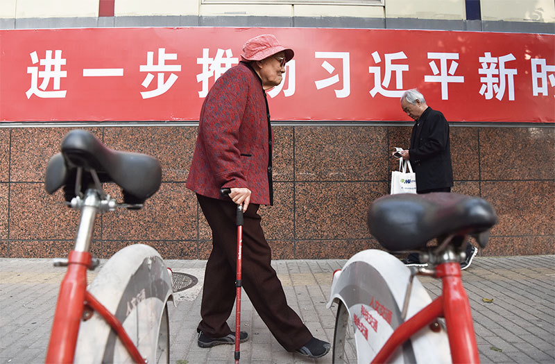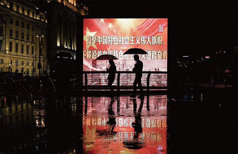 北京深陷中美貿易戰和香港問題兩大危機之際,習近平拋出鬥爭論,實際上暴露了他來自於黨內的挑戰,習對中共政權及其個人權力危機深重。圖為2017年10月27日北京街頭一標語。(AFP)