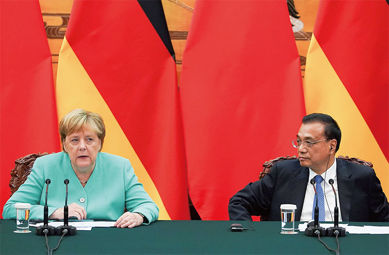 9月6日德國總理默克爾訪中會談後的記者會上提到香港問題,李克強回應保障「一國兩制」,維持港人治港,高度自治。但在中共官媒的報導中,兩人講話都被屏蔽了。(AFP)