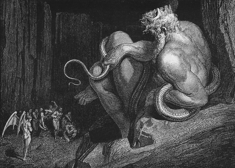 皮埃爾說:「當凶狠的靈魂離開自己用暴力掙脫的肉體時,米諾斯就把它打發到第七谷裡。」圖為《神曲》中的米諾斯。(公有領域)