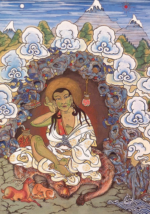 密勒日巴當時在馬爾巴上師的鍛鍊下不停的般石頭造房子。圖為〈密勒日巴〉唐卡,奧特根巴亞爾.額爾舒(Otgo Otgonbayar Ershuu)。(維基百科)