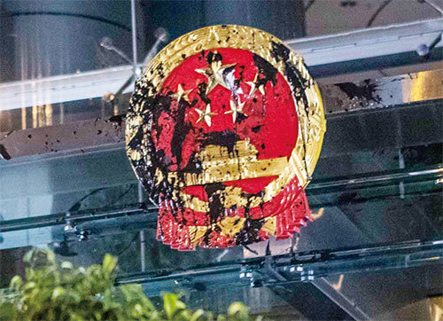香港反送中運動已把衝擊矛頭指向中共中央。圖為7月21日反送中遊行後,晚間有抗爭者聚集中聯辦,中共國徽標誌被噴黑。(余鋼/大紀元)