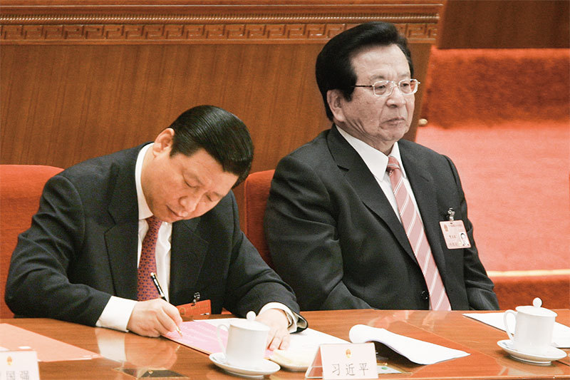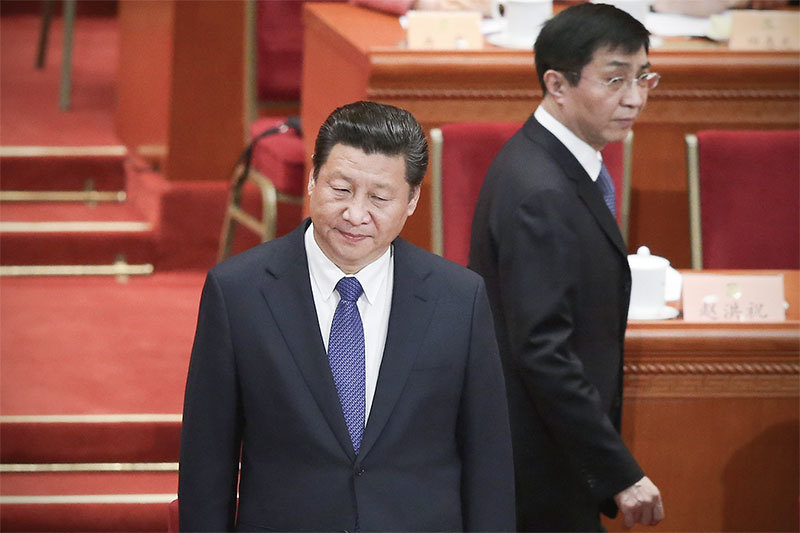 王滬寧(後)掌控的中共黨媒催促習近平(前)趕快對香港動手,其實是對習另一種形式的政變。圖為2015年中共兩會。(Getty Images)