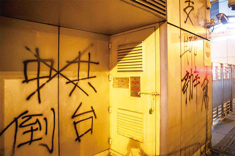 7月21日,香港民陣發起的反送中遊行,晚間有抗爭者聚集在中聯辦外,並在其外牆上塗鴉抗議。(余鋼/大紀元)