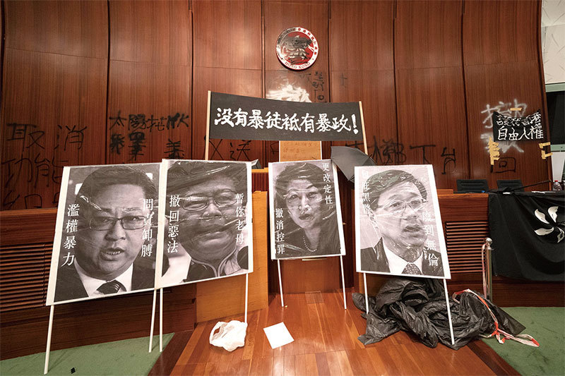 三、抗爭者占領前立法會會議廳已滿地狼藉。