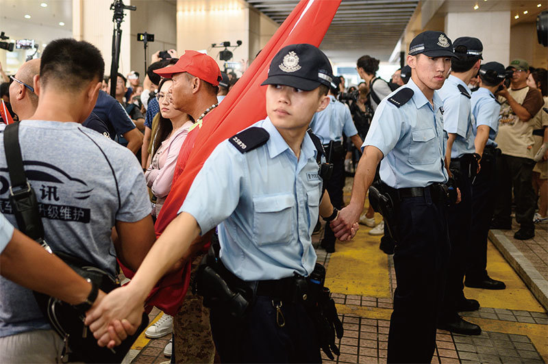 9月18日部分撐警民眾在尖沙咀舉中共五星旗並唱「國歌」遊行,與反送中群眾爆口角衝突,港警築起人鏈護送親共民眾坐警車離去。(AFP)