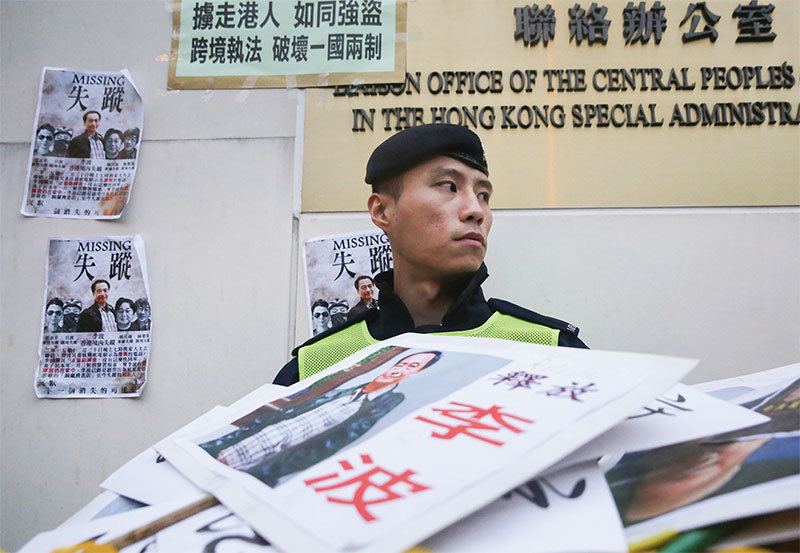 李江舟擔任公安部港澳臺辦主任時發生銅鑼灣書店事件。圖為2016年1月10日港人遊行至中聯辦,要求中共釋放五名失蹤的書商。(AFP)