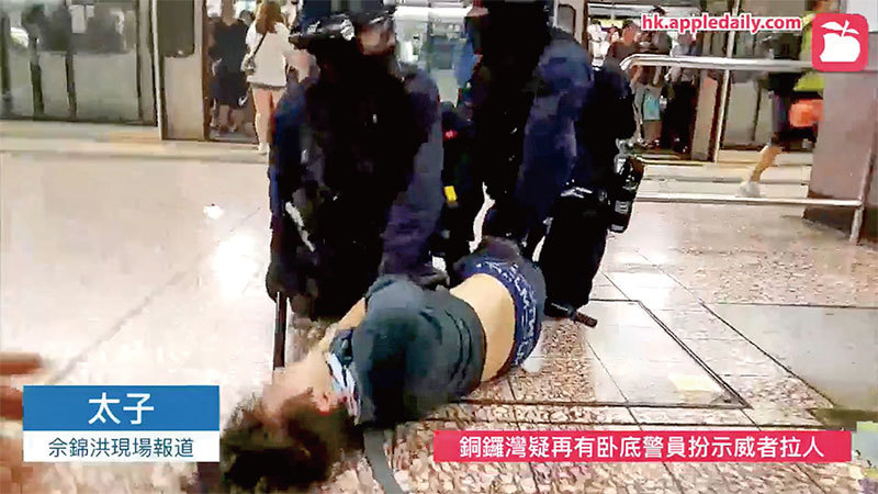 據《蘋果日報》在Facebook上的一段視頻顯示,8月31日晚,在太子站月臺,四、五名警察圍堵了一名年輕人,他已無路可逃,但那些警察毫不遲疑地揮棍猛打其頭部,之後把他摁倒在地,一名警察用手卡住年輕人的頸喉。