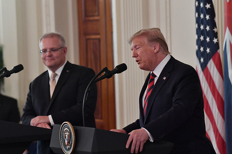 9月20日,特朗普總統在與澳洲總理莫里森(左)一起舉行的新聞發布會上,就近期中美貿易戰傳言澄清或說明,「我們正在尋求的是完整的協議。我不想達成部分協議。」(AFP)