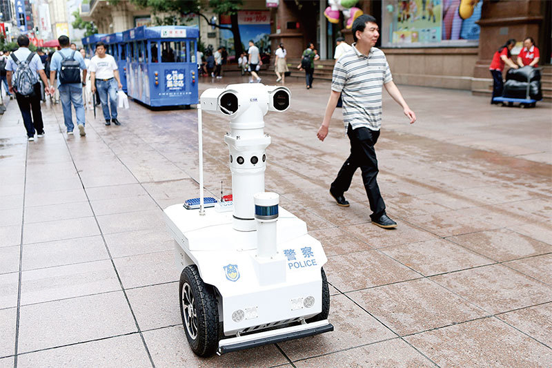 中共監控民眾的手段持續升級,9月6日,上海首位5G機器人警察「瓦力」在南京路步行街巡邏,監視民眾的行為。(大紀元資料室)