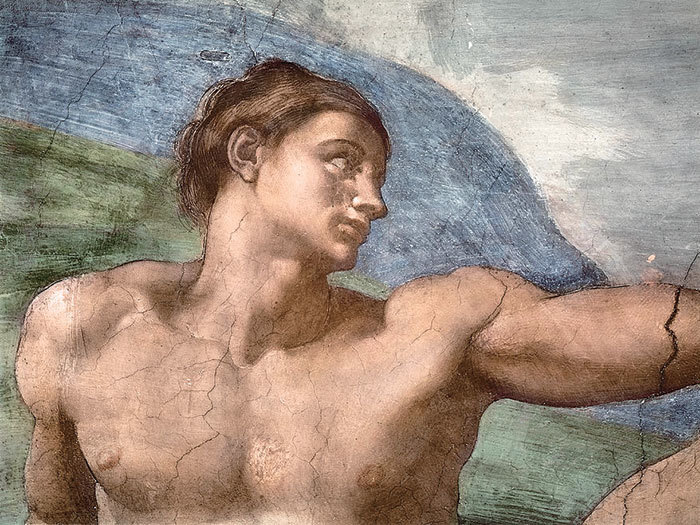 不過也許,神已經完成了祂的工作:亞當已經活了。亞當並不是「正在誕生」,而是在對天賜生命作出回應。他斜倚的姿勢、他與神之手的距離、崇拜的表情,好像都在表達感激。這提示我,米開朗基羅在描繪亞當面對神的姿勢時,有意畫得既有生氣,又斜倚放鬆、無私忘我,以表達亞當對於神賜的感激。