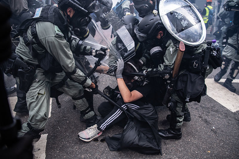 作為一種政治武器,日益軍事化的香港警察激怒了眾多香港人,抗議活動已經變成了慢動作革命。圖為2019年10月1日,香港警察毆打一位抗議民眾。(Getty Images)